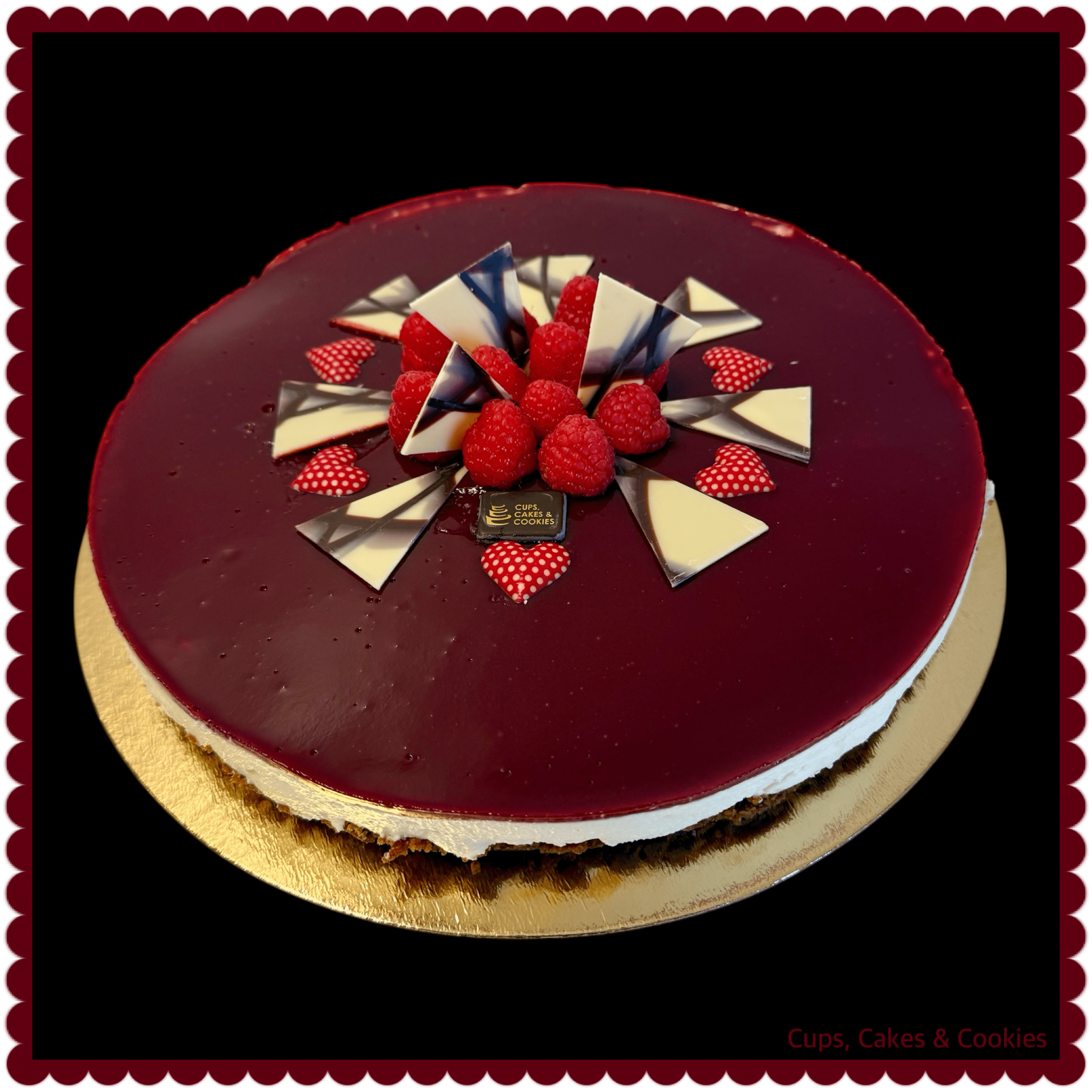 Cheescake met witte chocolade, bastogne koekjes, frambozen gelei.